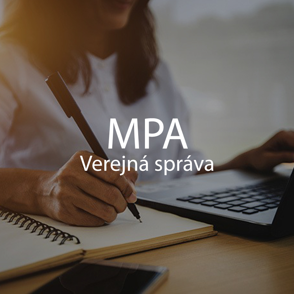 Program je určený pracovníkom verejnej správy, ktorí vykonávajú alebo ašpirujú na vedúce funkcie v štátnej správe. Program MPA predstavuje variantu štúdia MBA, uplatňovaného v privátnej sfére, zohľadňujúci špecifiká verejnej správy v tom najširšom slova zmysle. Cieľom štúdia MPA je poskytnúť nové poznatky špeciálne zamerané na problematiku štátnej správy a samosprávy, ďalej rozšíriť a prehĺbiť odborné znalosti z vybraných oblastí verejnej správy. Program možno študovať 100% online.